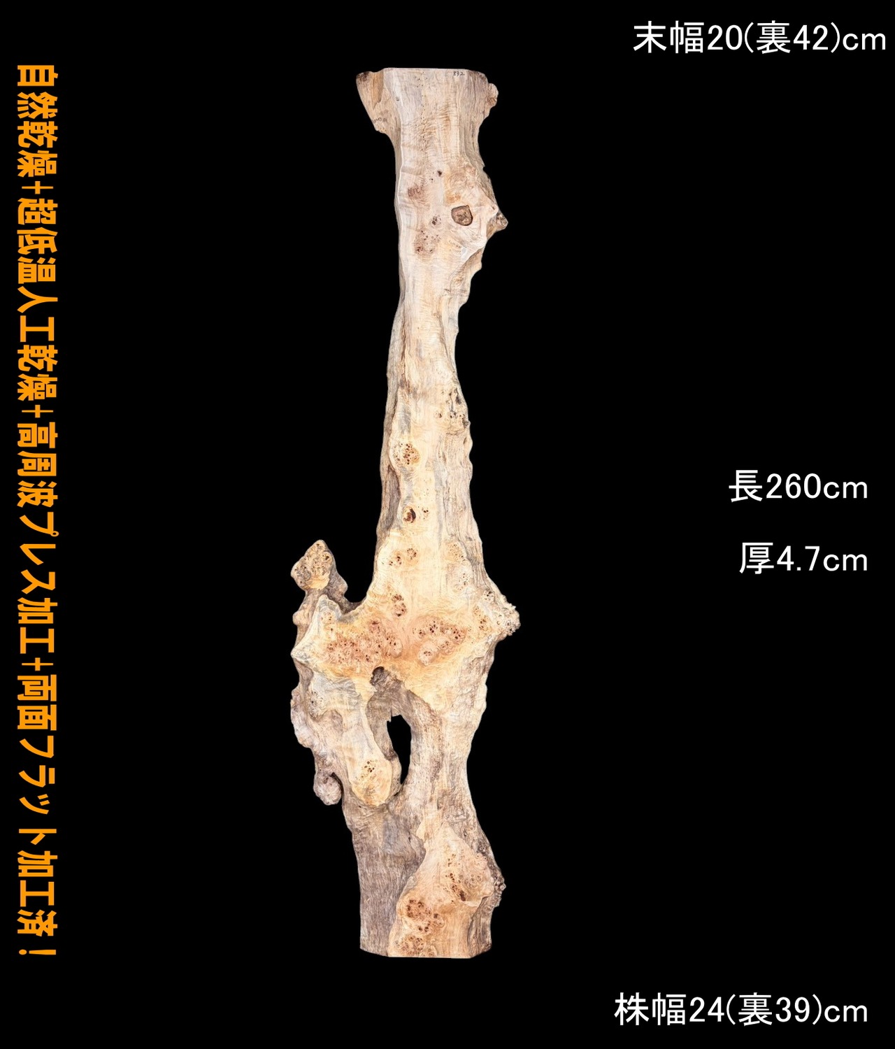 寸法:長260cm× 末幅20cm(裏42cm) ~ 中間幅10-70cm ~ 株幅24cm(裏39cm)× 厚4.7cm 約16kg